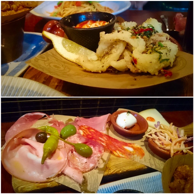 We shared 3 starters between us Cured Meat plank for 1 which includes: Fennel salami, pistachio mortadella, prosciutto & schiacciata piccante served with mini buffalo mozzarella, pecorino & chilli jam, a selection of pickles, olives & crunchy vegetable slaw. A portion of Pork Scratching with orchard dipping sauce and finally a portion of Calamari Crispy Squid with garlic lemon mayo, chilli, parsley and fried garlic.