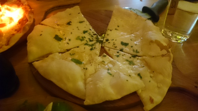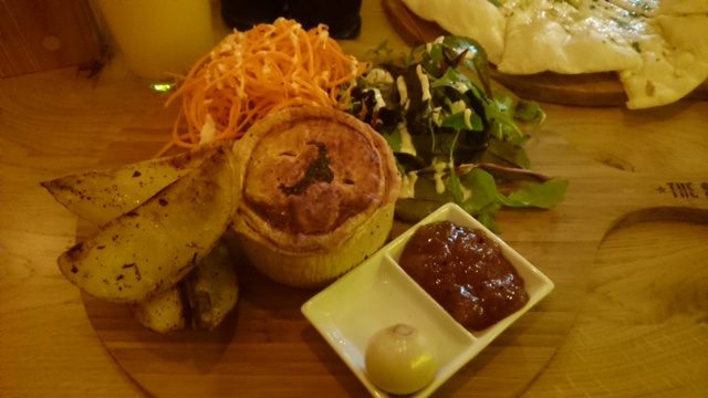 The menu consisted a selection of pizza, pies, sides, salads and large selection of cider offerings. Hubby ordered a pint of Black Rat Perry and obviously soft drinks for me so a pint of OJ. Looking through the menu we wanted to try a bit of everything so we decided to order the freshly made cheese garlic and parsley pizza bread. This was my favourite, it was thin based served warm seasoned with the perfect amount of garlic butter and cheese and a fresh sprinkle of parsley. I would quite happily pop in for a drink and order this to nibble on.