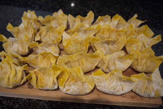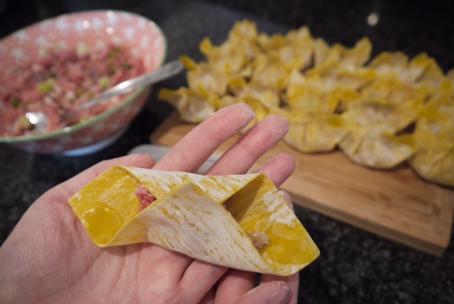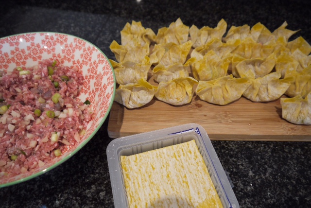 Wrapping wontons is one of those things the more often you do it the fast you get. It's very easy to do and something the whole family can get stuck in on. It may seem a lot but when you eat around 5-6 at a time and there are 2 of you they do go quick. I made Gyoza's a while back and they are just as easy to make - full Gyoza recipe.