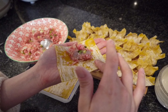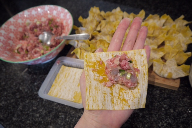 Chop up: prawns / water chestnuts and spring onion. Then mix it all in with the pork and season with soy sauce / sesame oil and salt. If you have time you can chop it all up and bind the ingredients further then its ready to be wrapped up as shown below. To ensure the wonton pastry sticks together you just need to dab each corners of the pastry with water.