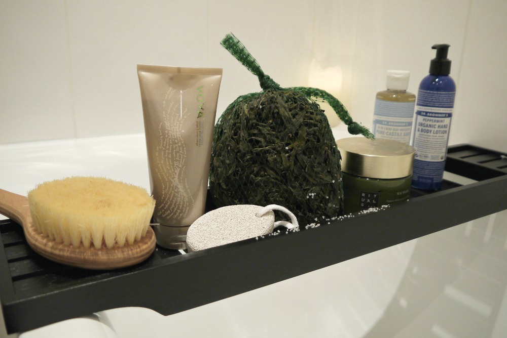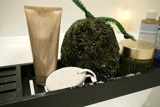 After brushing I like to get in the shower quickly use Dr Bronner's 18 in 1 hemp baby unscented pure castile soap before exfoliating and recently trying Voya's time to shine gentle ginger & sweet orange body polish to take away any left over skin so the body is ready to soak in plenty of moisture / goodness from my seaweed bath. The beads in the polish are finely ground walnut shell so it's very gentle on your skin and to finish off I like to use a pumice stone for the soles of my feet again just to scrub away any dead skin.