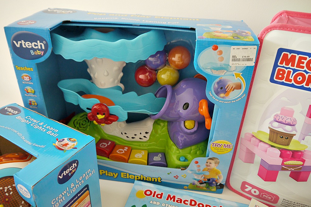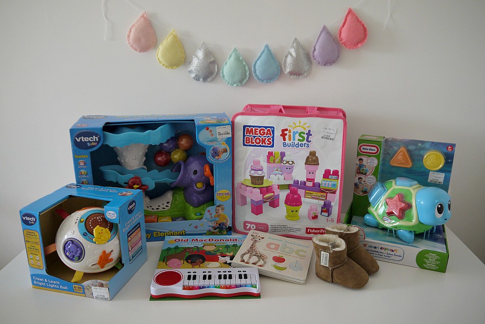 Our little one seems to be at that age where she's just started playing with toys a little more so it's been difficult in deciding what to buy. So we have lots of things that move to get her interested an elephant that shoots balls out, walking turtle with shapes popping out and a ball that rolls around. I also picked up some cute winter booties along with 2 books a piano one so we can do a bit of singing and a Sophie La Giraffe (We love Sophie) alphabet peekaboo one. I think a few more books ones with sounds then we are pretty much done!